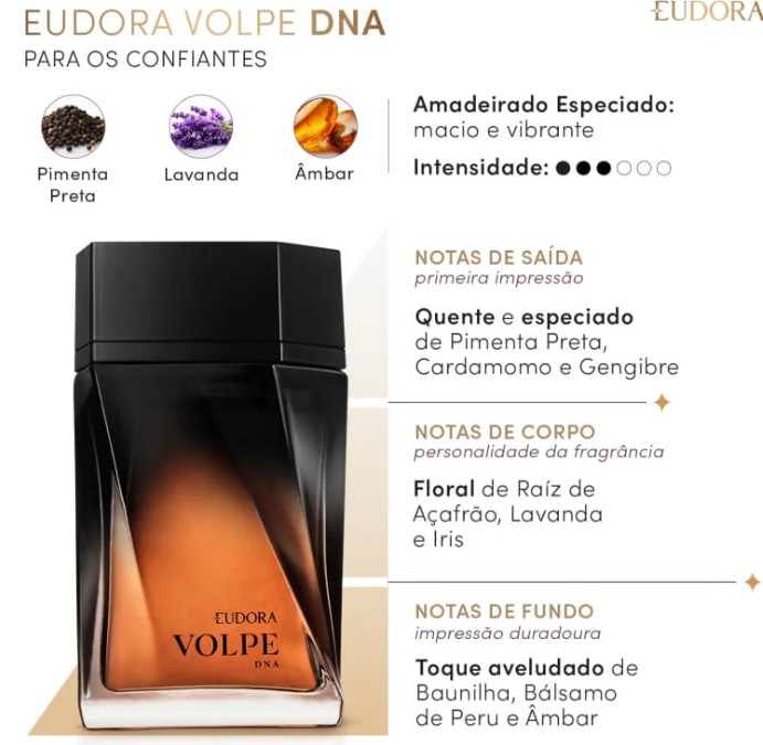Com uma perfumação única e exclusiva, Volpe DNA possui um amadeirado especiado envolvente, feito para atrair a atenção por onde for. As especiarias mescladas com patchouli e cipreste impressionam com notas vibrantes e estimulantes que combinam com a ousadia e originalidade de todo homem Volpe.